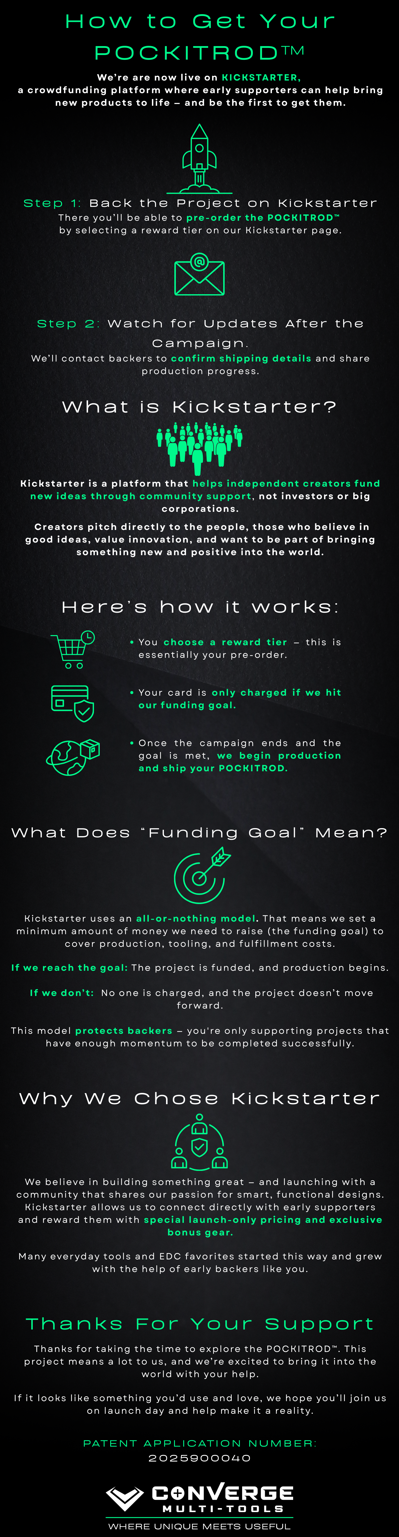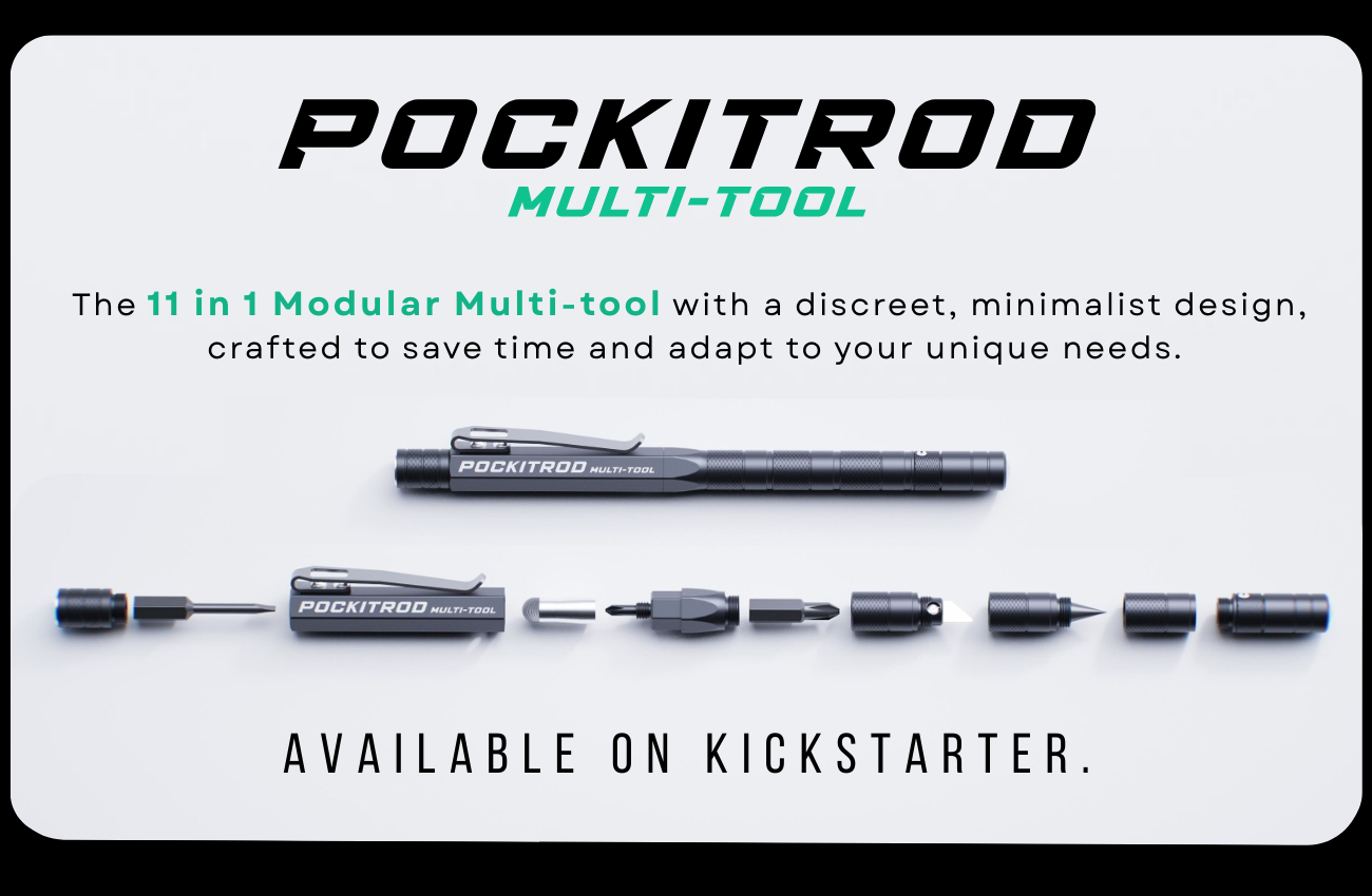 Wide. Weighing: 1.76oz (50g). “An Ideal pocket carry”. How to Get Your POCKITROD™ We’re getting ready to launch the POCKITROD™ through KICKSTARTER, a crowdfunding platform where early supporters can help bring new products to life — and be the first to get them. Step 1: Sign Up to Be Notified. Join our email list via the sign-up form below and we’ll send you updates and a direct link to the campaign when we go live. Step 2: Back the Project on Kickstarter. Once we launch, you’ll be able to pre-order the POCKITROD™ by selecting a reward tier on our Kickstarter page. What is Kickstarter? Kickstarter is a platform that helps independent creators fund new ideas through community support, not investors or big corporations. Creators pitch directly to the people, those who believe in good ideas, value innovation, and want to be part of bringing something new and positive into the world. Here’s how it works: Here’s how it works: You choose a reward tier — this is essentially your pre-order. Your card is only charged if we hit our funding goal. Once the campaign ends and the goal is met, we begin production and ship your POCKITROD. What Does “Funding Goal” Mean? Kickstarter uses an all-or-nothing model. That means we set a minimum amount of money we need to raise (the funding goal) to cover production, tooling, and fulfillment costs. If we reach the goal: The project is funded, and production begins. If we don’t: No one is charged, and the project doesn’t move forward. This model protects backers — you're only supporting projects that have enough momentum to be completed successfully. Why We Chose Kickstarter. We believe in building something great — and launching with a community that shares our passion for smart, functional designs. Kickstarter allows us to connect directly with early supporters and reward them with special launch-only pricing and exclusive bonus gear. Many everyday tools and EDC favorites started this way and grew with the help of early backers like you. Thanks For Your Support. Thanks for taking the time to explore the POCKITROD™. This project means a lot to us, and we’re excited to bring it into the world with your help. If it looks like something you’d use and love, we hope you’ll join us on launch day and help make it a reality. Patent application number: 2025900040. Converge multi-tools. Where unique meets useful.
